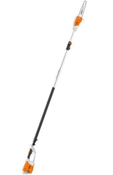 Cordless pole pruner with telescopic shaft. Lightweight and powerful, with 1/4" PM3 saw chain with particularly easy biting characteristics and good cutting performance, low vibration and quiet for use in urban areas, fully equipped with side chain tensioning, total length from 270 to 390 cm, weight 4.8g.